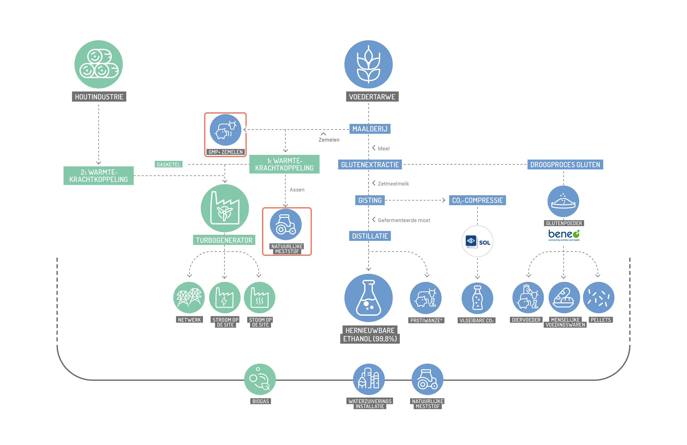 Maalafval en een deel van de tarwezemelen worden gebruikt als brandstof in de biomassaketel. Het overschot aan edele zemelen wordt verkocht op de veevoedermarkt. Het is een bron van vezels uit lokale grondstoffen, een vervanging voor geïmporteerd voer voor onze Europese veehouderijen.